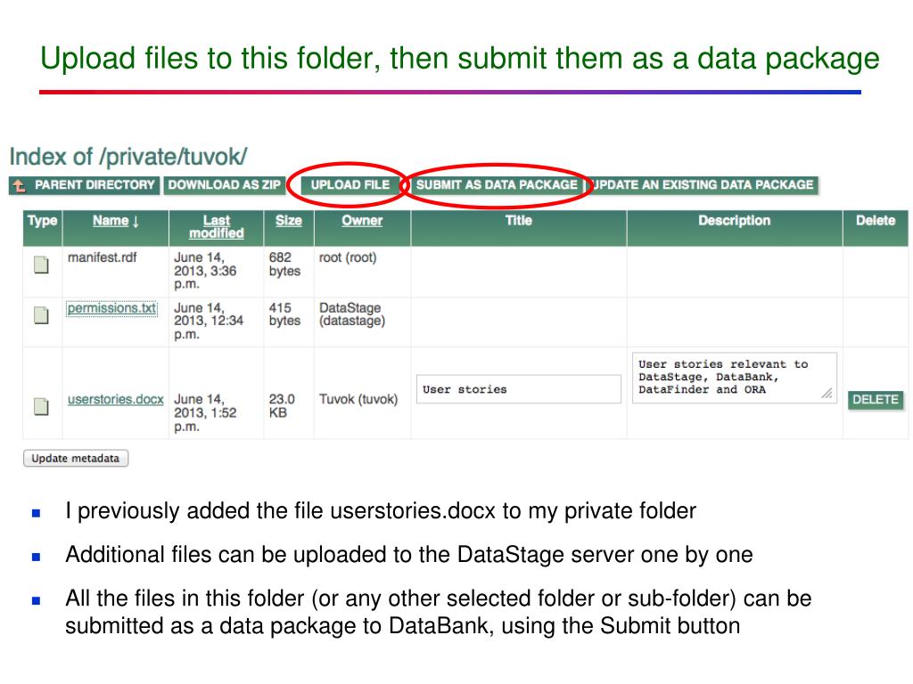 Upload files to this folder, then submit them as a data package • I previously added the file userstories.docxto my private folder • Additional files can be uploaded to the DataStage server one by one • All the files in this folder (or any other selected folder or sub-folder) can be submitted as a data package to DataBank, using the Submit button