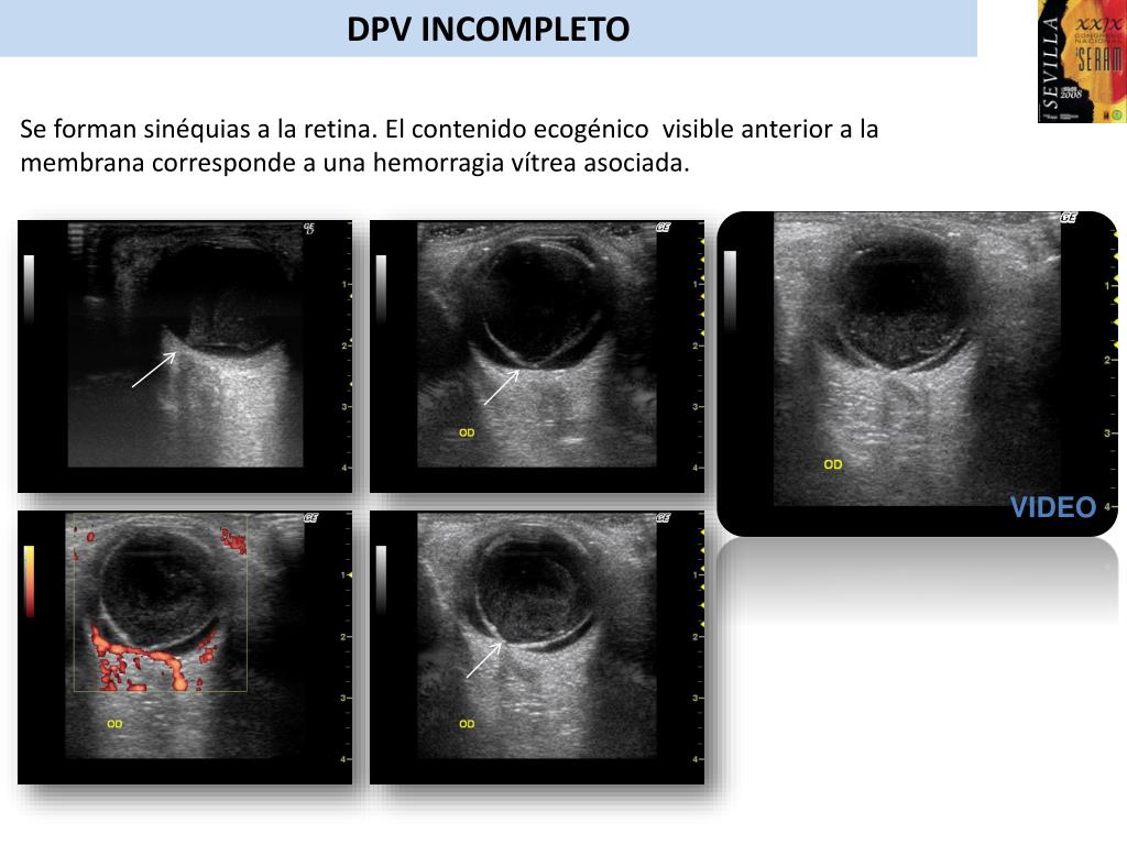 DPV INCOMPLETO Se forman sinéquias a la retina. El contenido ecogénico visible anterior a la membrana corresponde a una hemorragia vítrea asociada. VIDEO