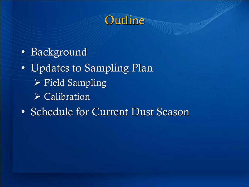 Outline • Background • Updates to Sampling Plan • Field Sampling • Calibration • Schedule for Current Dust Season