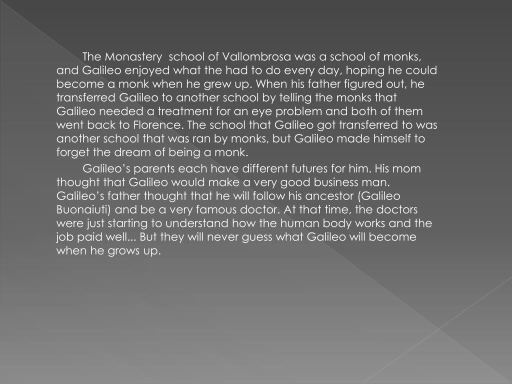 The Monastery school of Vallombrosa was a school of monks, and Galileo enjoyed what the had to do every day, hoping he could become a monk when he grew up. When his father figured out, he transferred Galileo to another school by telling the monks that Galileo needed a treatment for an eye problem and both of them went back to Florence. The school that Galileo got transferred to was another school that was ran by monks, but Galileo made himself to forget the dream of being a monk. Galileo’s parents each have different futures for him. His mom thought that Galileo would make a very good business man. Galileo’s father thought that he will follow his ancestor (Galileo Buonaiuti) and be a very famous doctor. At that time, the doctors were just starting to understand how the human body works and the job paid well... But they will never guess what Galileo will become when he grows up.