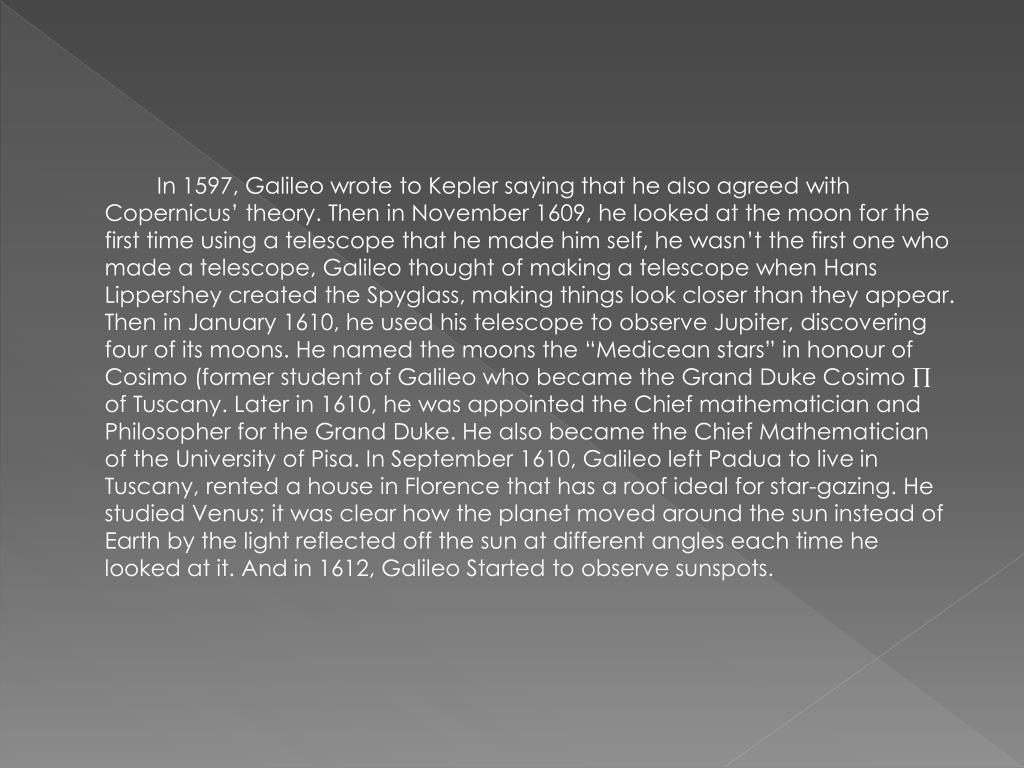 In 1597, Galileo wrote to Kepler saying that he also agreed with Copernicus’ theory. Then in November 1609, he looked at the moon for the first time using a telescope that he made him self, he wasn’t the first one who made a telescope, Galileo thought of making a telescope when Hans Lippershey created the Spyglass, making things look closer than they appear. Then in January 1610, he used his telescope to observe Jupiter, discovering four of its moons. He named the moons the “Medicean stars” in honour of Cosimo (former student of Galileo who became the Grand Duke Cosimo of Tuscany. Later in 1610, he was appointed the Chief mathematician and Philosopher for the Grand Duke. He also became the Chief Mathematician of the University of Pisa. In September 1610, Galileo left Padua to live in Tuscany, rented a house in Florence that has a roof ideal for star-gazing. He studied Venus; it was clear how the planet moved around the sun instead of Earth by the light reflected off the sun at different angles each time he looked at it. And in 1612, Galileo Started to observe sunspots.