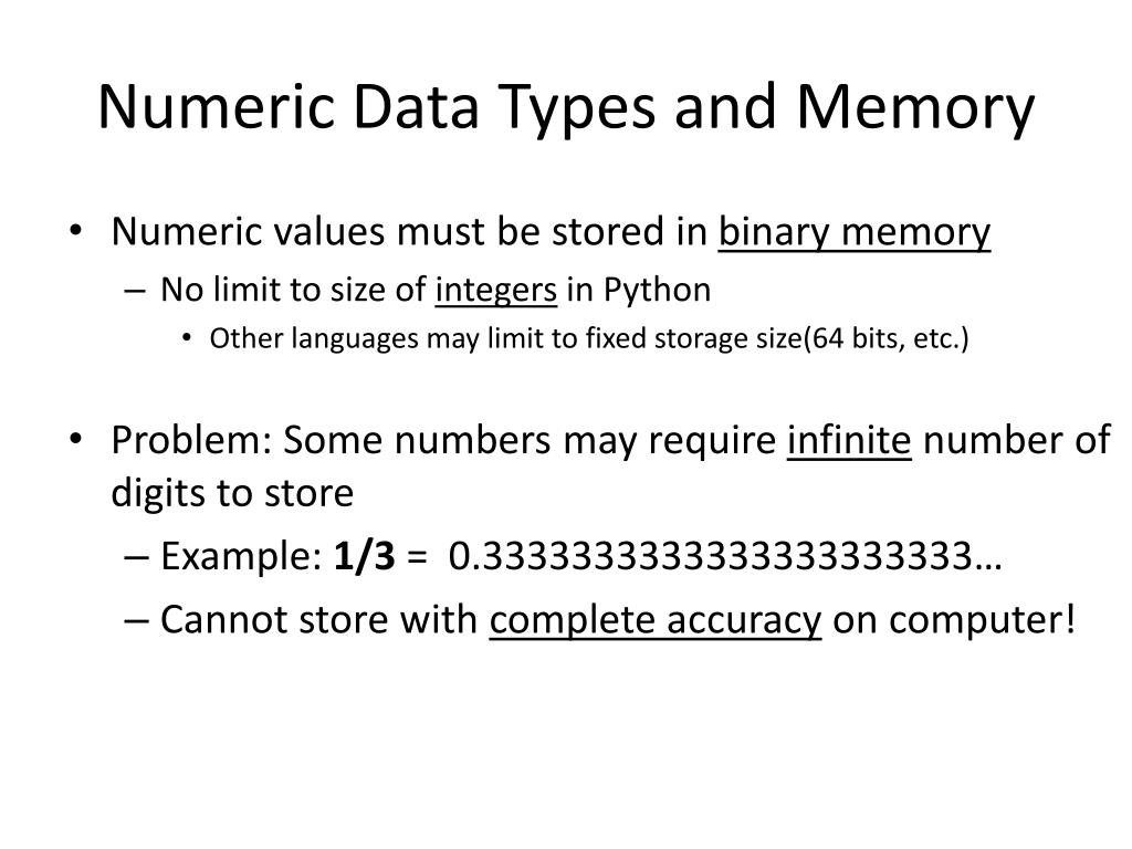 Numeric Data Types and Memory • Numeric values must be stored in binary memory • No limit to size of integers in Python • Other languages may limit to fixed storage size(64 bits, etc.) • Problem: Some numbers may require infinite number of digits to store • Example: 1/3 = 0.3333333333333333333333… • Cannot store with complete accuracy on computer!