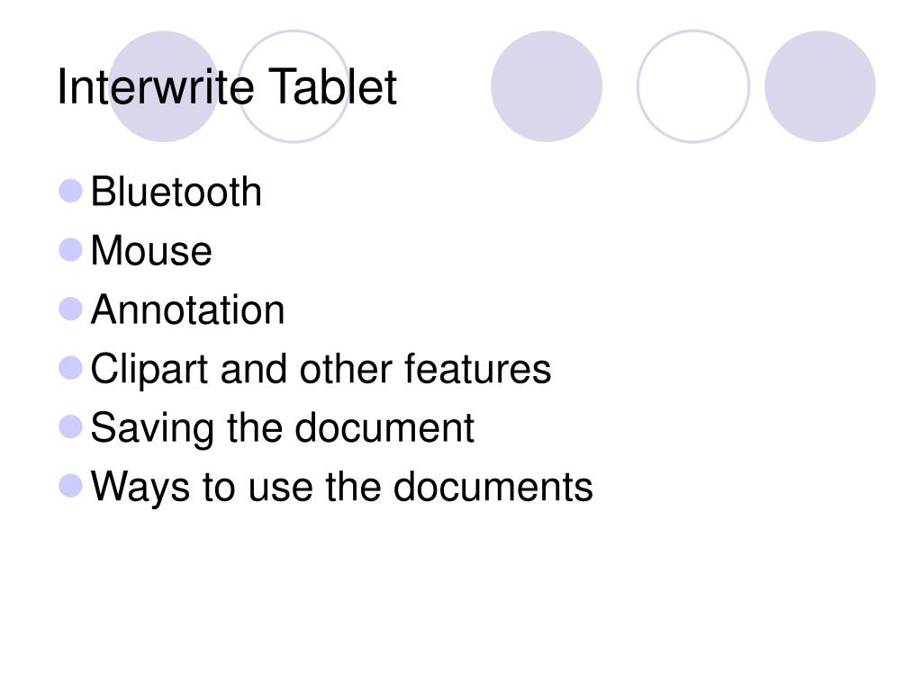 Interwrite Tablet • Bluetooth • Mouse • Annotation • Clipart and other features • Saving the document • Ways to use the documents