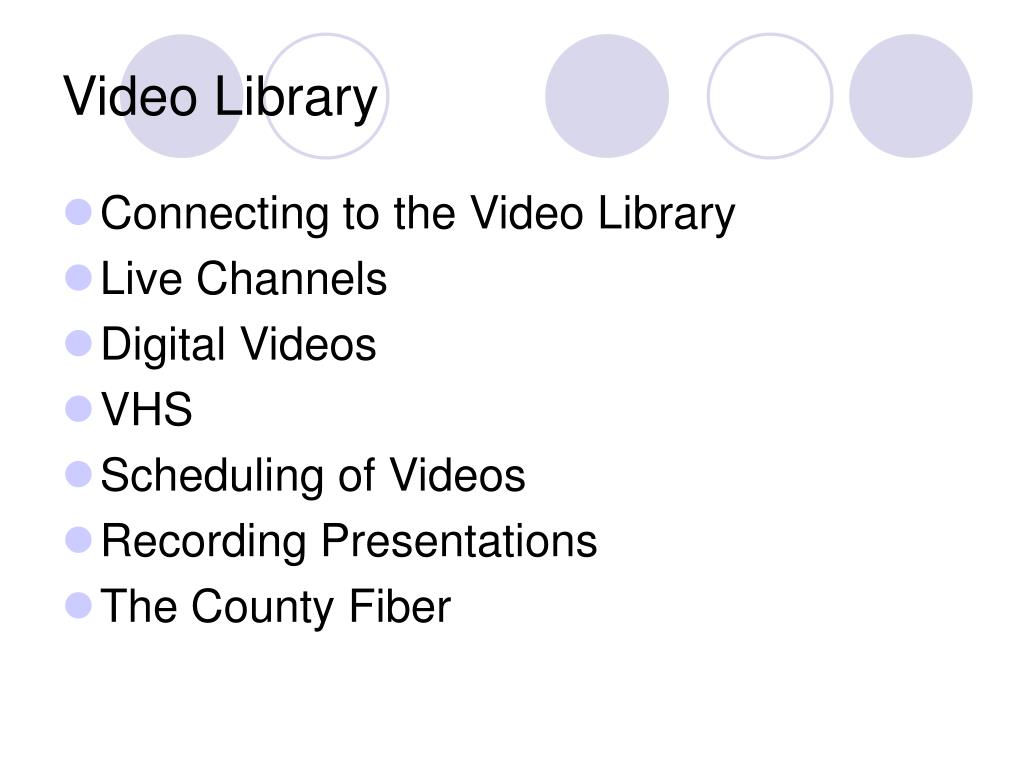 Video Library • Connecting to the Video Library • Live Channels • Digital Videos • VHS • Scheduling of Videos • Recording Presentations • The County Fiber