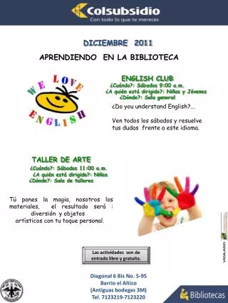 DICIEMBRE 2011 APRENDIENDO EN LA BIBLIOTECA ENGLISH CLUB ¿Cuándo?: Sábados 9:00 a.m. ¿A quién está dirigido?: Niños y Jóvenes¿Dónde?: Sala general ¿Do youunderstandEnglish?...Ven todos los sábados y resuelve tus dudas frente a este idioma. TALLER DE ARTE ¿Cuándo?: Sábados 11:00 a.m. ¿A quién está dirigido?: Niños ¿Dónde?: Sala de talleres Tú pones la magia, nosotros los materiales, el resultado será : diversión y objetos artísticos con tu toque personal. Las actividades son de entrada libre y gratuita. Diagonal 6 Bis No. 5-95 Barrio el Altico(Antiguas bodegas 3M) Tel. 7123219-7123220