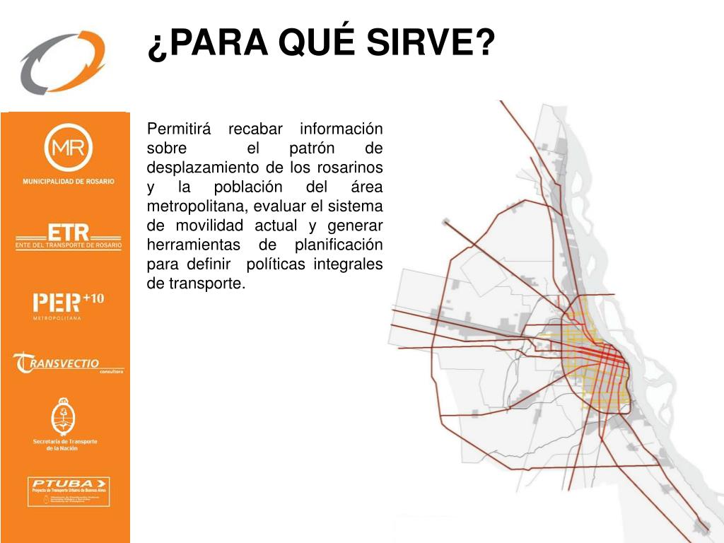 ¿PARA QUÉ SIRVE? Permitirá recabar información sobre el patrón de desplazamiento de los rosarinos y la población del área metropolitana, evaluar el sistema de movilidad actual y generar herramientas de planificación para definir políticas integrales de transporte.
