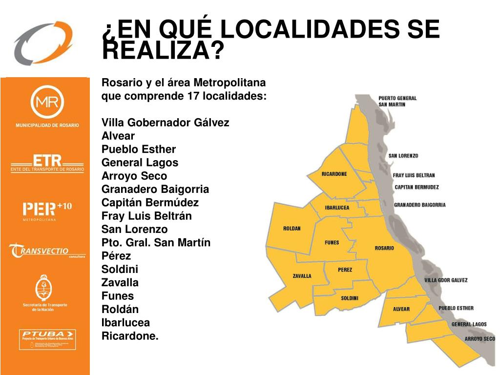 ¿EN QUÉ LOCALIDADES SE REALIZA? Rosario y el área Metropolitana que comprende 17 localidades: Villa Gobernador Gálvez Alvear Pueblo Esther General Lagos Arroyo Seco Granadero Baigorria Capitán Bermúdez Fray Luis Beltrán San Lorenzo Pto. Gral. San Martín Pérez Soldini Zavalla Funes Roldán Ibarlucea Ricardone.