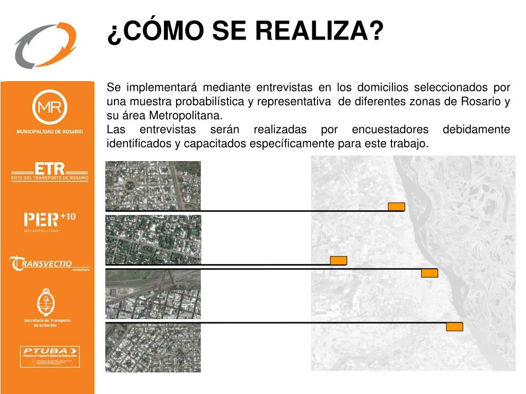 ¿QUIÉNES SON LOS RESPONSABLES? La Municipalidad de Rosario, a través del Ente del Transporte de Rosario (ETR) ha sido incluida en el Proyecto de Transporte Urbano de Buenos Aires (PTUBA), mediante Convenio entre el Gobierno Nacional y el Banco Internacional de Reconstrucción y Fomento (BIRF). A través de este proyecto la Secretaría de Transporte de la Nación efectuó un llamado a Licitación Internacional para realizar estudios de movilidad en el Área Metropolitana de Rosario, resultando adjudicada la Consultora Transvectio. Este estudio prevé, entre otros proyectos, la realización de la Encuesta Origen Destino 2008 (EOD). La misma estará a cargo de un equipo de profesionales pertenecientes a la Consultora Transvectio y bajo la supervisión del Ente del Transporte de Rosario, contando con la participación del Plan Estratégico Rosario Metropolitana (PERM).