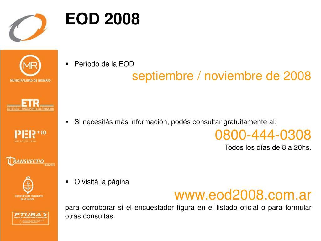 EOD 2008 • Período de la EOD septiembre / noviembre de 2008 • Si necesitás más información, podés consultar gratuitamente al: • 0800-444-0308 • Todos los días de 8 a 20hs. • O visitá la página • www.eod2008.com.ar • para corroborar si el encuestador figura en el listado oficial o para formular otras consultas.