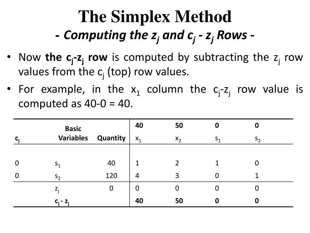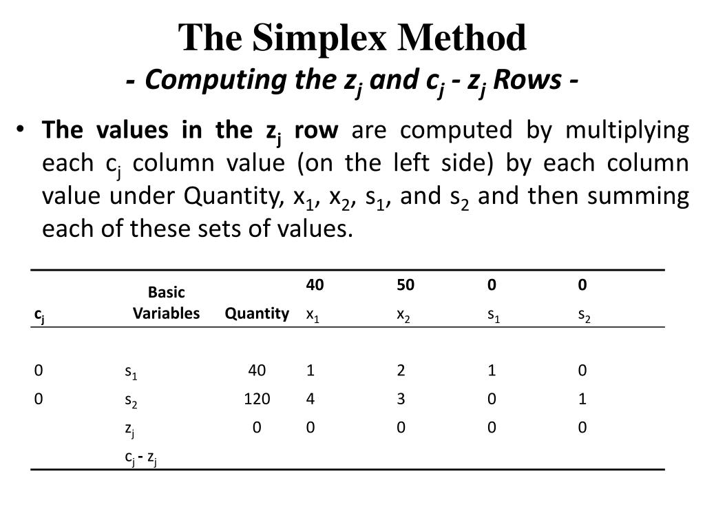 The Simplex Method- Computing the zj and cj - zj Rows - • For example, the value in the zj row under the quantity column is found as follows. Cj x Qty 0 x 40 = 0 0 x 120 = 0 Zj= 0 • The value in the zj row under the x1 column is found similarly. Cj x X1 0 x 1 = 0 0 x 2 = 0 Zj= 0