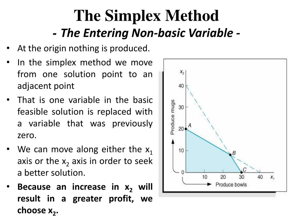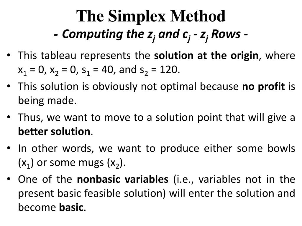 The Simplex Method- Computing the zj and cj - zj Rows - • This tableau represents the solution at the origin, where x1 = 0, x2 = 0, s1 = 40, and s2 = 120. • This solution is obviously not optimal because no profit is being made. • Thus, we want to move to a solution point that will give a better solution. • In other words, we want to produce either some bowls (x1) or some mugs (x2). • One of the nonbasic variables (i.e., variables not in the present basic feasible solution) will enter the solution and become basic.