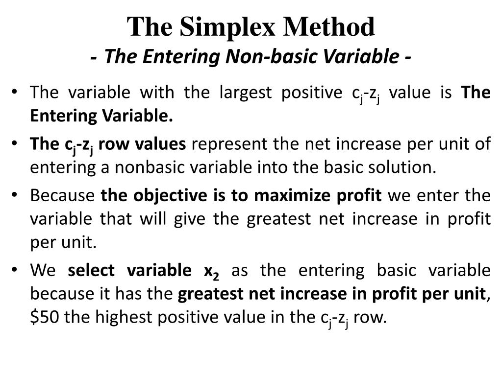 The Simplex Method- The Entering Non-basic Variable - • The variable with the largest positive cj-zjvalue is The Entering Variable. • The cj-zjrow values represent the net increase per unit of entering a nonbasic variable into the basic solution. • Because the objective is to maximize profit we enter the variable that will give the greatest net increase in profit per unit. • We select variable x2as the entering basic variable because it has the greatest net increase in profit per unit, $50 the highest positive value in the cj-zjrow.