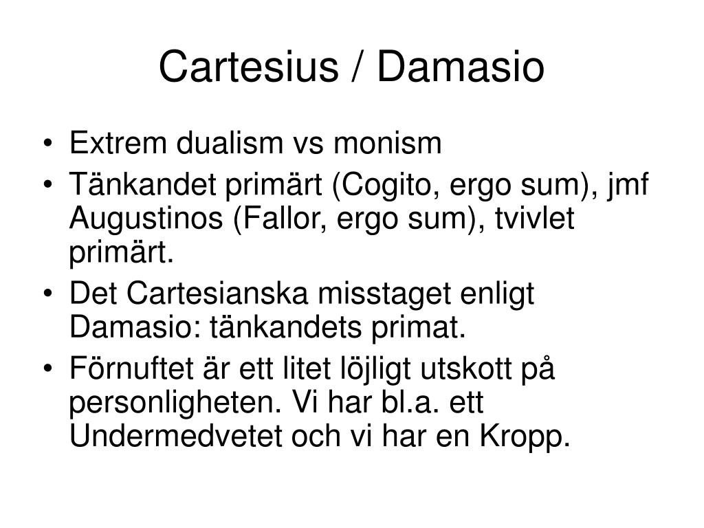 Cartesius / Damasio • Extrem dualism vs monism • Tänkandet primärt (Cogito, ergo sum), jmf Augustinos (Fallor, ergo sum), tvivlet primärt. • Det Cartesianska misstaget enligt Damasio: tänkandets primat. • Förnuftet är ett litet löjligt utskott på personligheten. Vi har bl.a. ett Undermedvetet och vi har en Kropp.