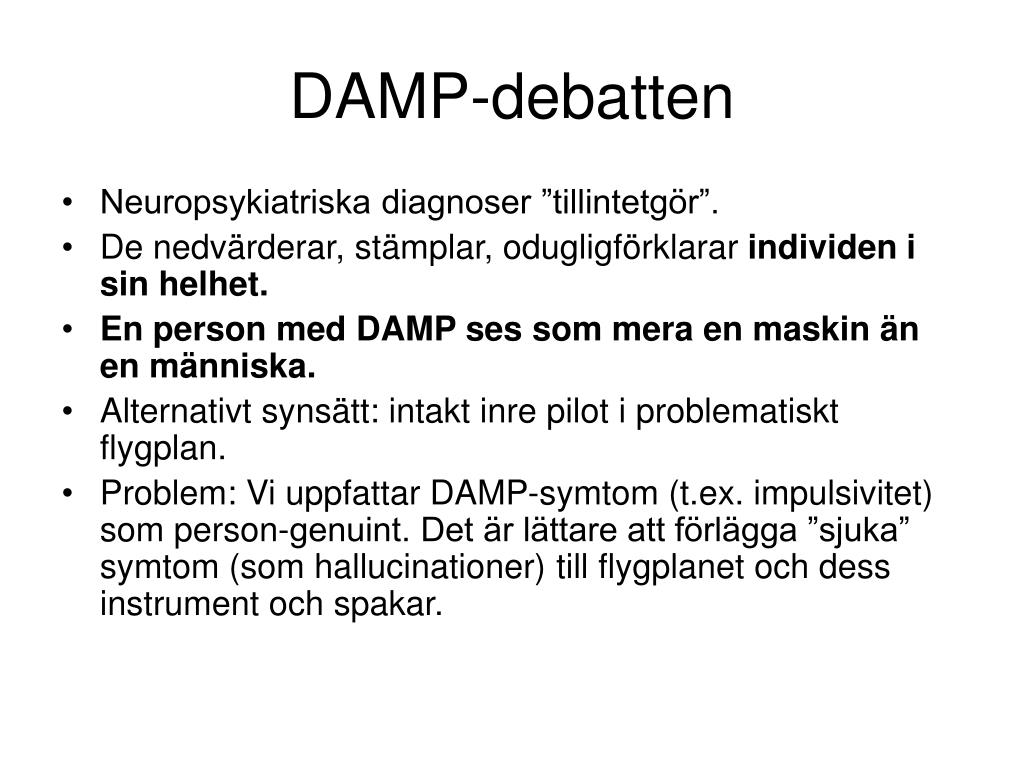DAMP-debatten • Neuropsykiatriska diagnoser ”tillintetgör”. • De nedvärderar, stämplar, odugligförklarar individen i sin helhet. • En person med DAMP ses som mera en maskin än en människa. • Alternativt synsätt: intakt inre pilot i problematiskt flygplan. • Problem: Vi uppfattar DAMP-symtom (t.ex. impulsivitet) som person-genuint. Det är lättare att förlägga ”sjuka” symtom (som hallucinationer) till flygplanet och dess instrument och spakar.