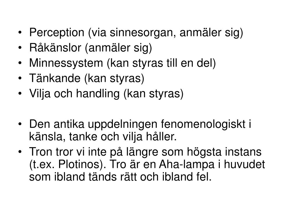 Perception (via sinnesorgan, anmäler sig) • Råkänslor (anmäler sig) • Minnessystem (kan styras till en del) • Tänkande (kan styras) • Vilja och handling (kan styras) • Den antika uppdelningen fenomenologiskt i känsla, tanke och vilja håller. • Tron tror vi inte på längre som högsta instans (t.ex. Plotinos). Tro är en Aha-lampa i huvudet som ibland tänds rätt och ibland fel.