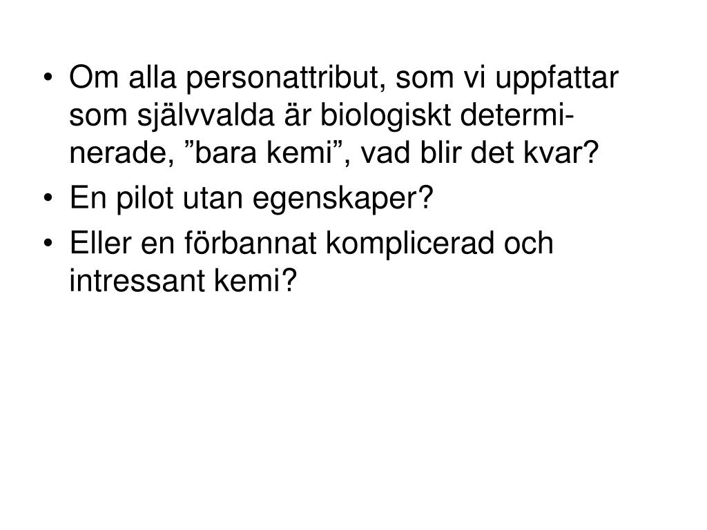 Om alla personattribut, som vi uppfattar som självvalda är biologiskt determi-nerade, ”bara kemi”, vad blir det kvar? • En pilot utan egenskaper? • Eller en förbannat komplicerad och intressant kemi?