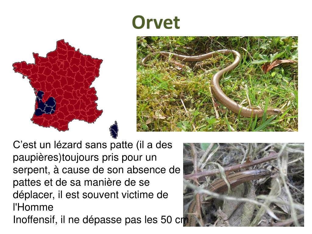 Orvet C’est un lézard sans patte (il a des paupières)toujours pris pour un serpent, à cause de son absence de pattes et de sa manière de se déplacer, il est souvent victime de l'Homme Inoffensif, il ne dépasse pas les 50 cm