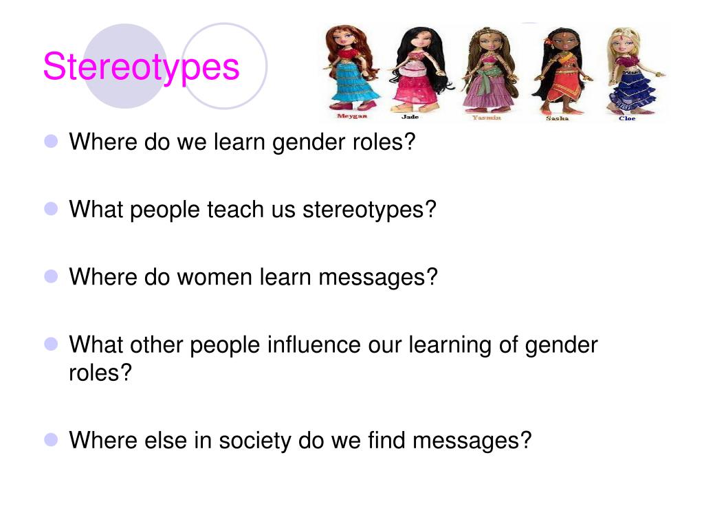 Stereotypes • Where do we learn gender roles? • What people teach us stereotypes? • Where do women learn messages? • What other people influence our learning of gender roles? • Where else in society do we find messages?