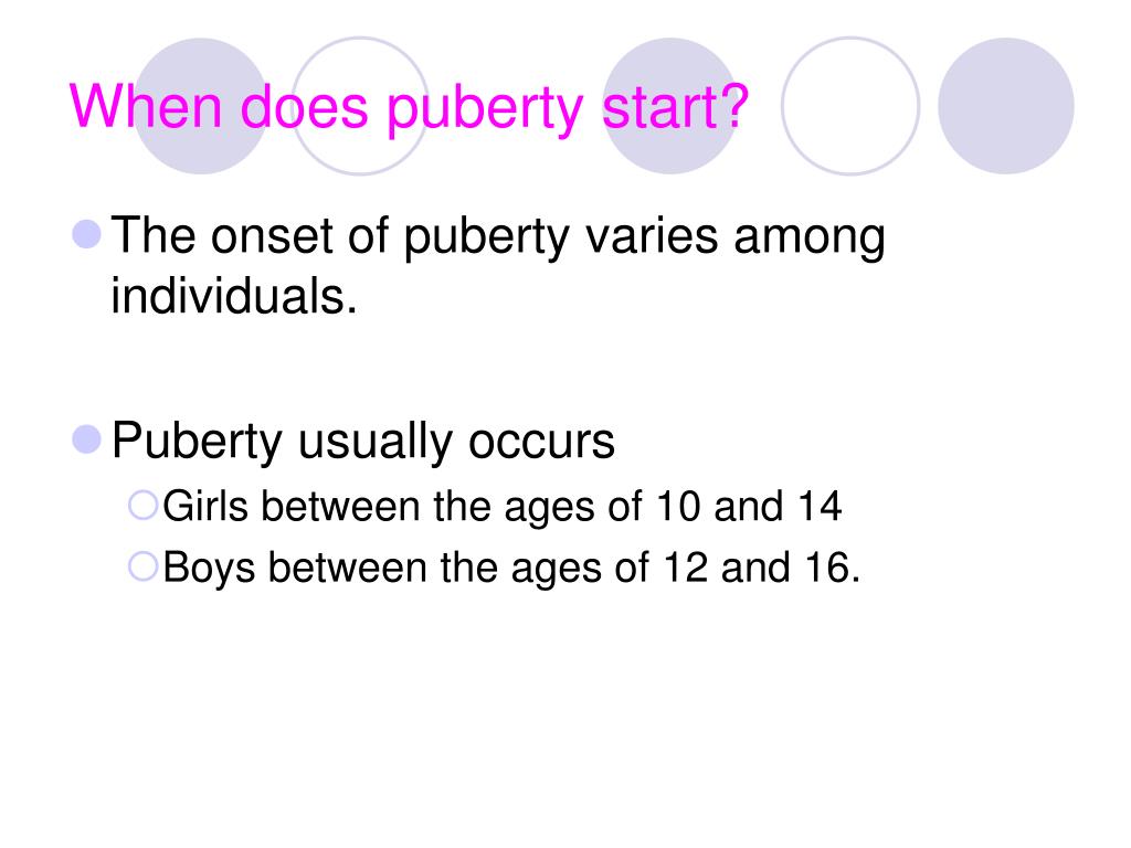 When does puberty start? • The onset of puberty varies among individuals. • Puberty usually occurs • Girls between the ages of 10 and 14 • Boys between the ages of 12 and 16.