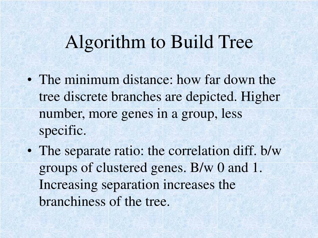 Algorithm to Build Tree • The minimum distance: how far down the tree discrete branches are depicted. Higher number, more genes in a group, less specific. • The separate ratio: the correlation diff. b/w groups of clustered genes. B/w 0 and 1. Increasing separation increases the branchiness of the tree.