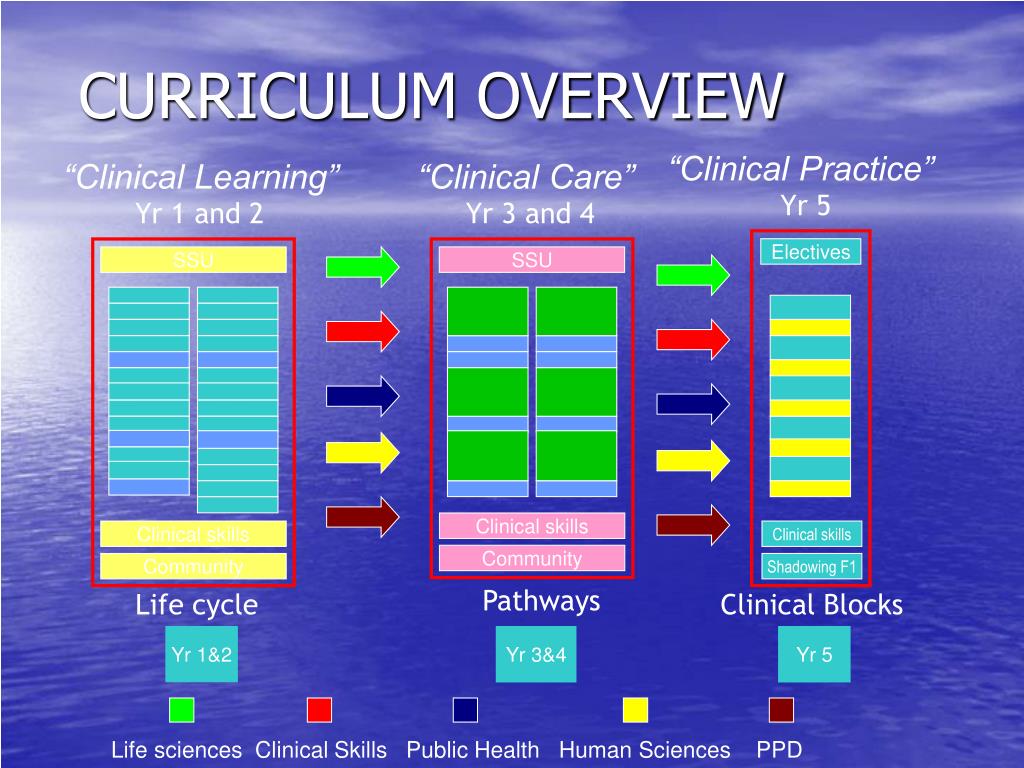 Life sciences Clinical Skills Public Health Human Sciences PPD CURRICULUM OVERVIEW “Clinical Practice” “Clinical Learning” “Clinical Care” Yr 5 Yr 1 and 2 Yr 3 and 4 Electives SSU SSU Clinical skills Clinical skills Clinical skills Community Community Shadowing F1 Pathways Life cycle Clinical Blocks Yr 1&2 Yr 3&4 Yr 5