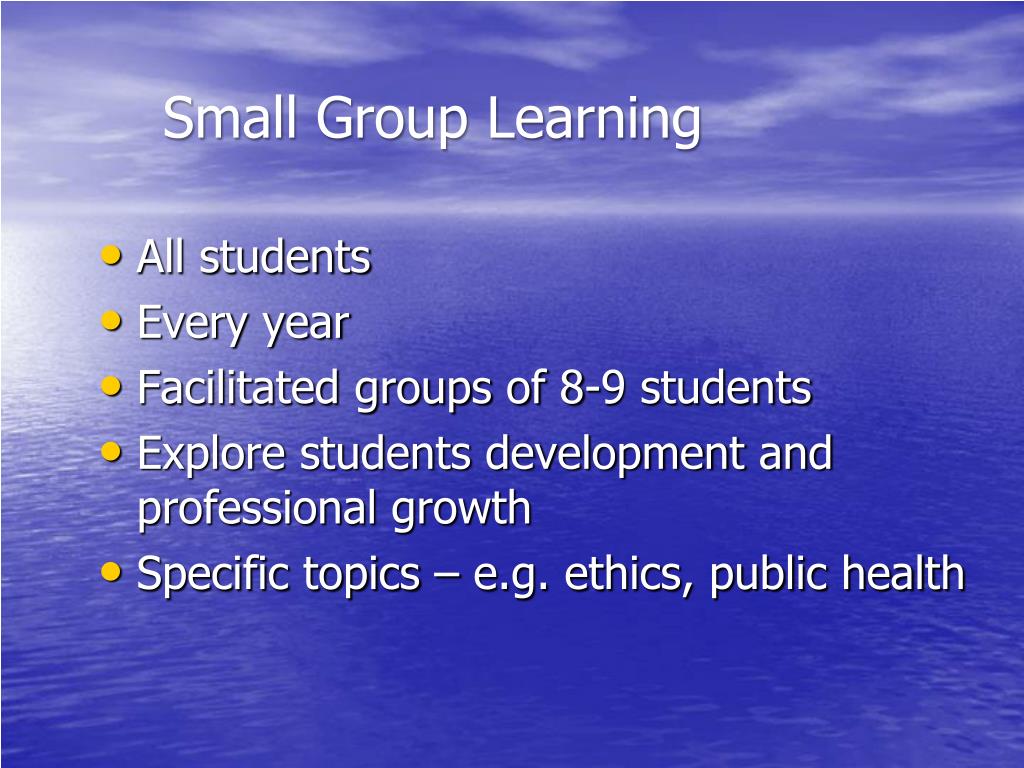 Small Group Learning • All students • Every year • Facilitated groups of 8-9 students • Explore students development and professional growth • Specific topics – e.g. ethics, public health
