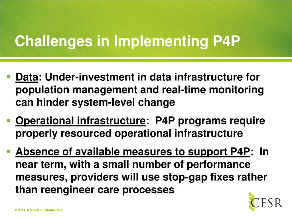 Challenges in Implementing P4P • Data: Under-investment in data infrastructure for population management and real-time monitoring can hinder system-level change • Operational infrastructure: P4P programs require properly resourced operational infrastructure • Absence of available measures to support P4P: In near term, with a small number of performance measures, providers will use stop-gap fixes rather than reengineer care processes