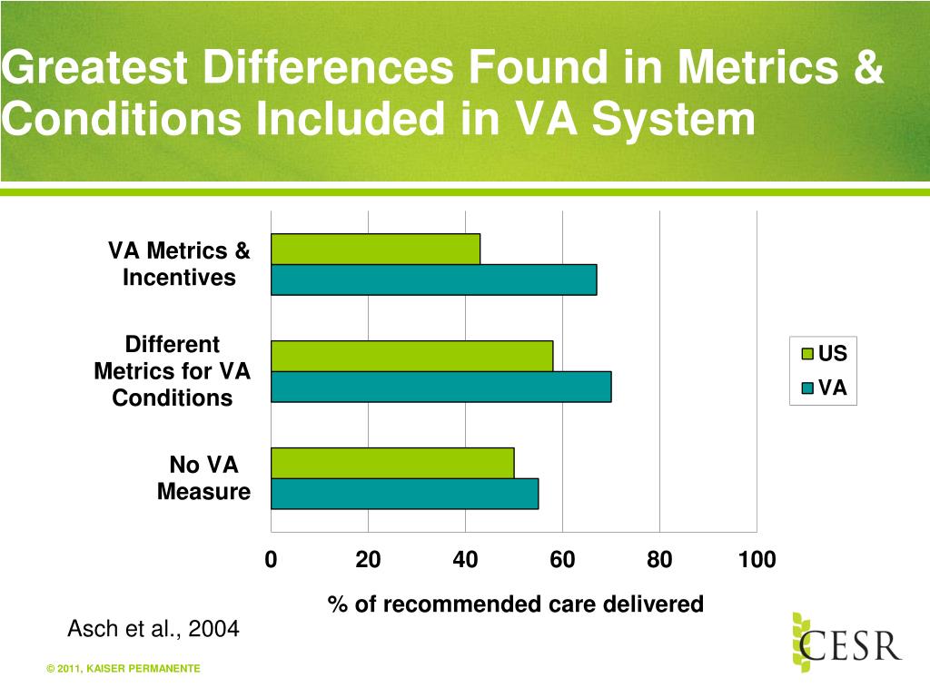 Greatest Differences Found in Metrics & Conditions Included in VA System Asch et al., 2004