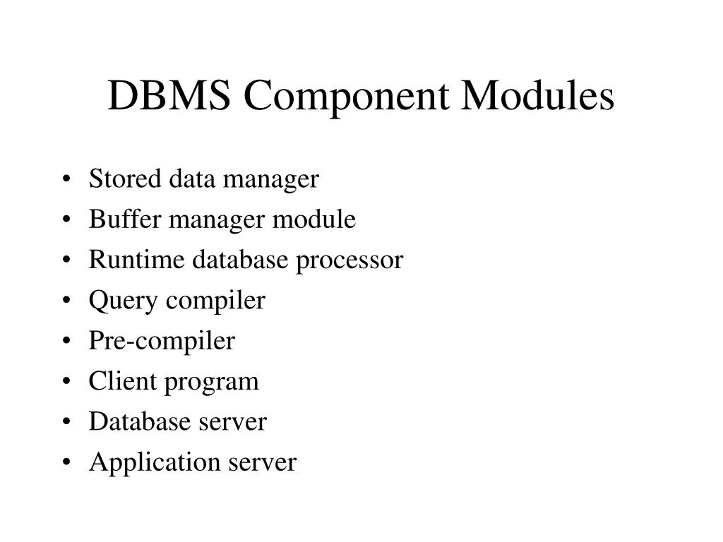 DBMS Component Modules • Stored data manager • Buffer manager module • Runtime database processor • Query compiler • Pre-compiler • Client program • Database server • Application server