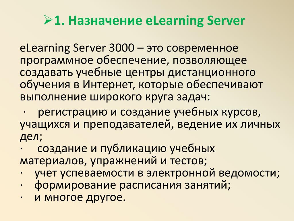 1. Назначение eLearning Server eLearning Server 3000 – это современное программное обеспечение, позволяющее создавать учебные центры дистанционного обучения в Интернет, которые обеспечивают выполнение широкого круга задач: · регистрацию и создание учебных курсов, учащихся и преподавателей, ведение их личных дел; · создание и публикацию учебных материалов, упражнений и тестов; · учет успеваемости в электронной ведомости;· формирование расписания занятий;· и многое другое.