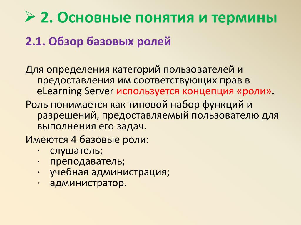2. Основные понятия и термины 2.1. Обзор базовых ролей Для определения категорий пользователей и предоставления им соответствующих прав в eLearning Server используется концепция «роли». Роль понимается как типовой набор функций и разрешений, предоставляемый пользователю для выполнения его задач. Имеются 4 базовые роли:· слушатель;· преподаватель;· учебная администрация;· администратор.