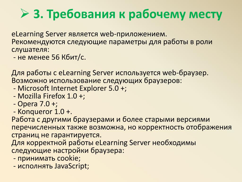 3. Требования к рабочему месту eLearning Server является web-приложением. Рекомендуются следующие параметры для работы в роли слушателя: - не менее 56 Кбит/с.Для работы с eLearning Server используется web-браузер.Возможно использование следующих браузеров: - MicrosoftInternetExplorer 5.0 +; - MozillaFirefox 1.0 +; - Opera 7.0 +; - Konqueror 1.0 +.Работа с другими браузерами и более старыми версиями перечисленных также возможна, но корректность отображения страниц не гарантируется.Для корректной работы eLearning Server необходимы следующие настройки браузера: - принимать cookie; - исполнять JavaScript;