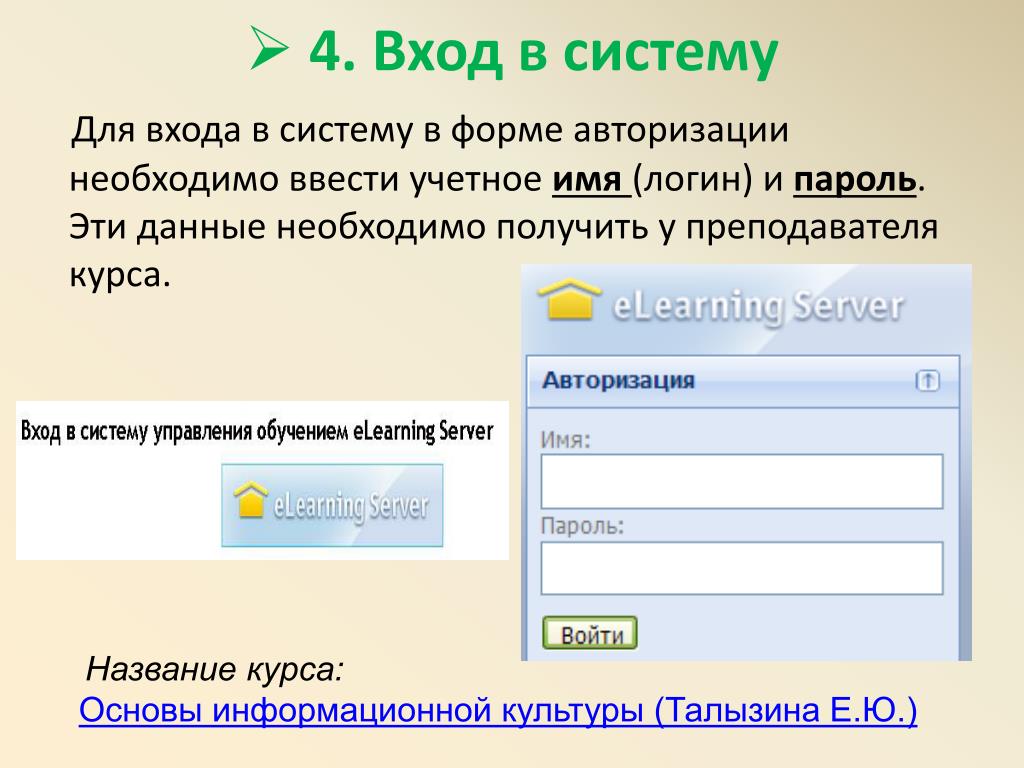 4. Вход в систему Для входа в систему в форме авторизации необходимо ввести учетное имя (логин) ипароль. Эти данные необходимо получить у преподавателя курса. Название курса:Основы информационной культуры (Талызина Е.Ю.)