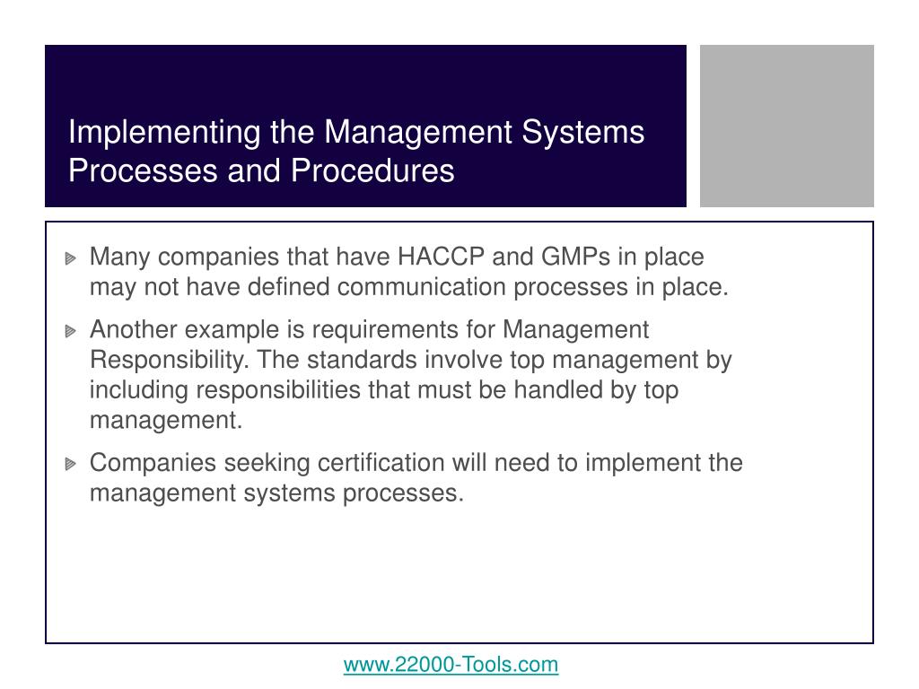 Implementing the Management SystemsProcesses and Procedures • Many companies that have HACCP and GMPs in place may not have defined communication processes in place. • Another example is requirements for Management Responsibility. The standards involve top management by including responsibilities that must be handled by top management. • Companies seeking certification will need to implement the management systems processes.