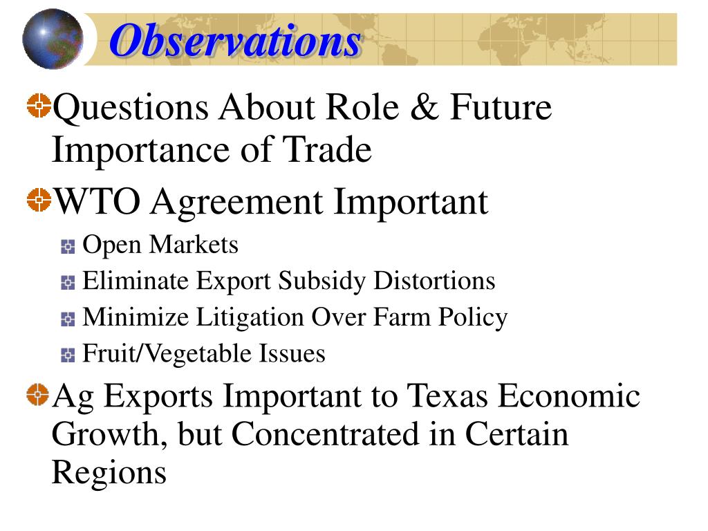 Observations • Questions About Role & Future Importance of Trade • WTO Agreement Important • Open Markets • Eliminate Export Subsidy Distortions • Minimize Litigation Over Farm Policy • Fruit/Vegetable Issues • Ag Exports Important to Texas Economic Growth, but Concentrated in Certain Regions