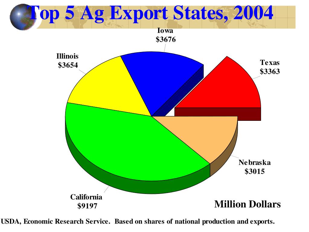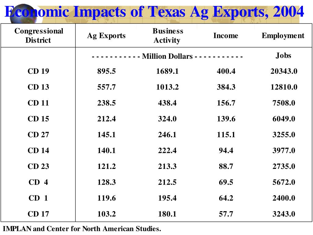 Ag Exports $3,363 million Texas Ag Export Impacts Business Activity ($ M) $6,558 Income ($ M) $2,724 Jobs (#) 88,875