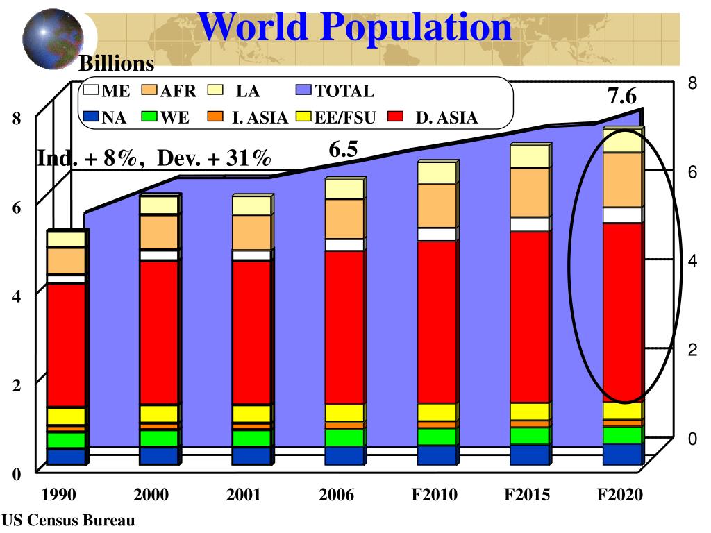 World Population US Census Bureau Billions 8 7.6 ME AFR LA TOTAL NA WE I. ASIA EE/FSU D. ASIA 8 6.5 Ind. + 8%, Dev. + 31% 6 6 4 4 2 2 0 0 1990 2000 2001 2006 F2010 F2015 F2020