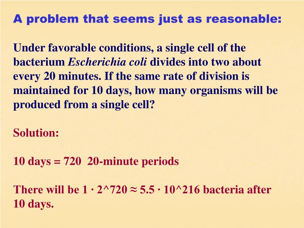 A problem that seems just as reasonable: Under favorable conditions, a single cell of the bacterium Escherichia coli divides into two about every 20 minutes. If the same rate of division is maintained for 10 days, how many organisms will be produced from a single cell? Solution: 10 days = 720 20-minute periods There will be 1 ∙ 2^720 ≈ 5.5 ∙ 10^216 bacteria after 10 days.