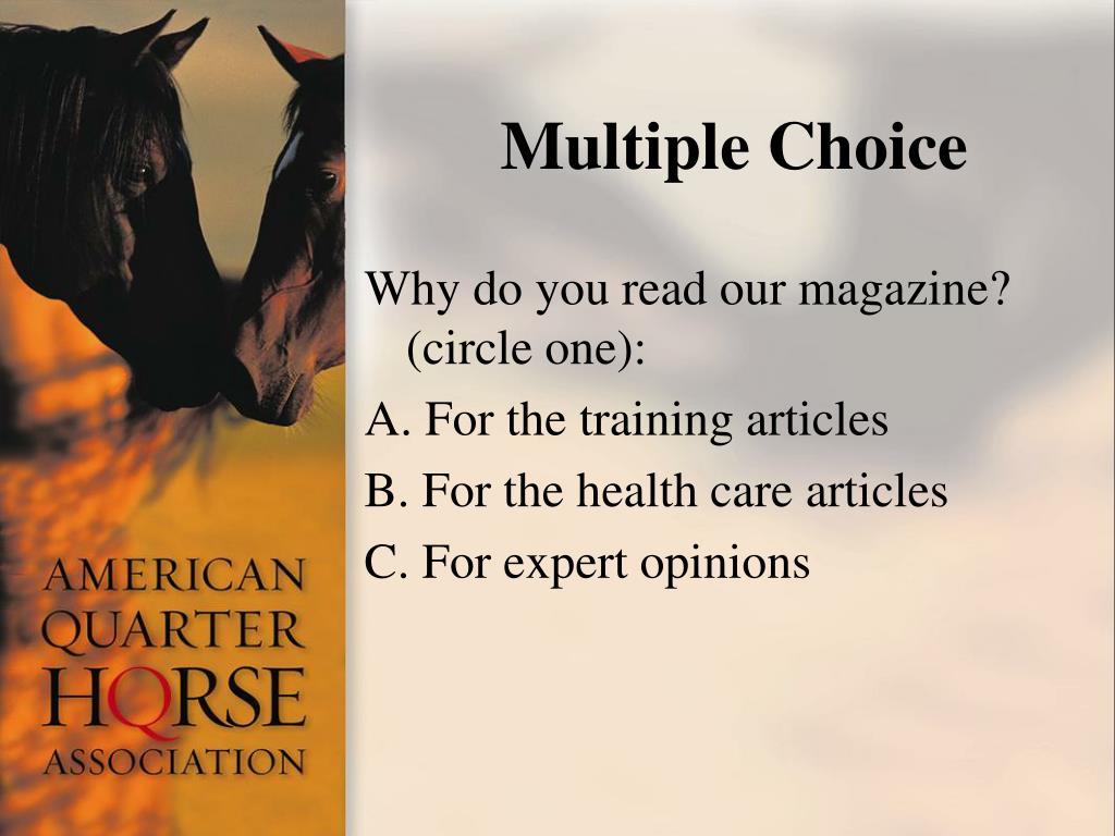Multiple Choice Why do you read our magazine? (circle one): A. For the training articles B. For the health care articles C. For expert opinions