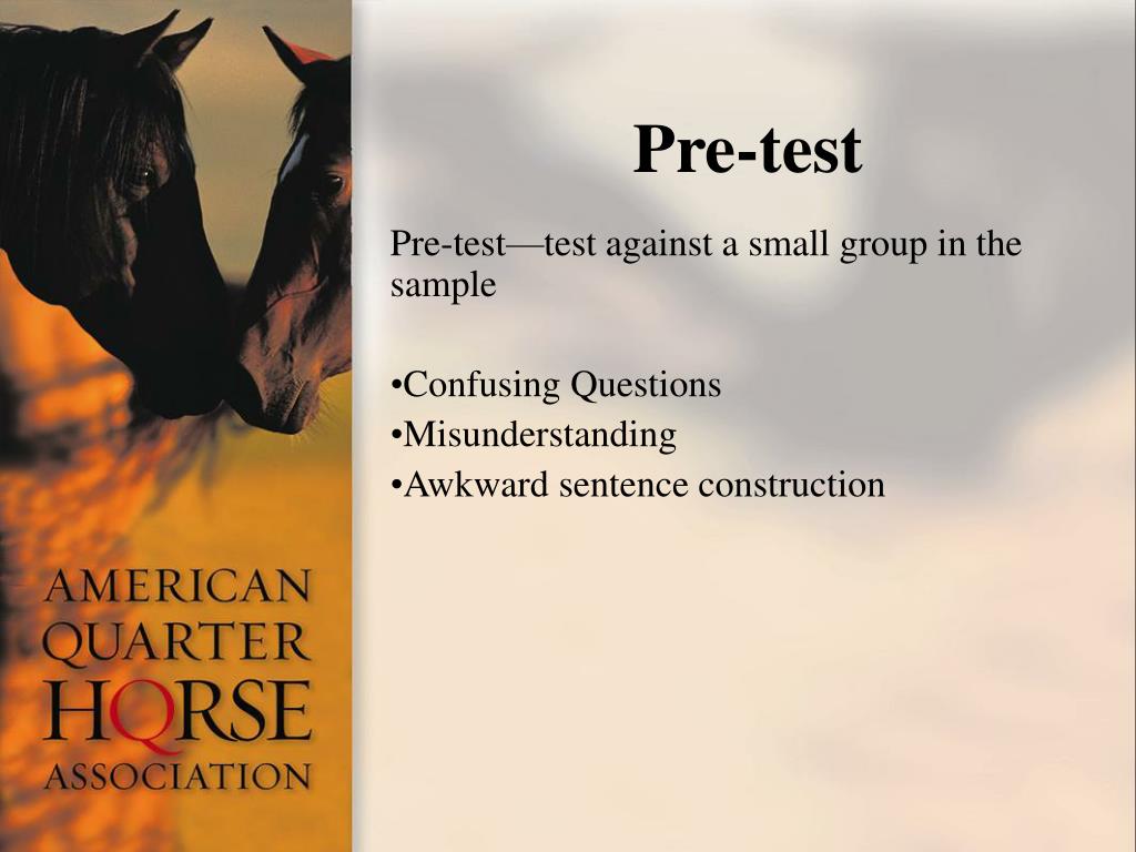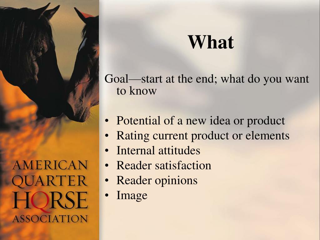 American Horse Publications. Survey Question Design. Billy Smith, EdD Executive Director/Information Technology American Quarter Horse Association. First things first. Goal start at the end; what do you want to know Sample from whom do you want to know Methodology