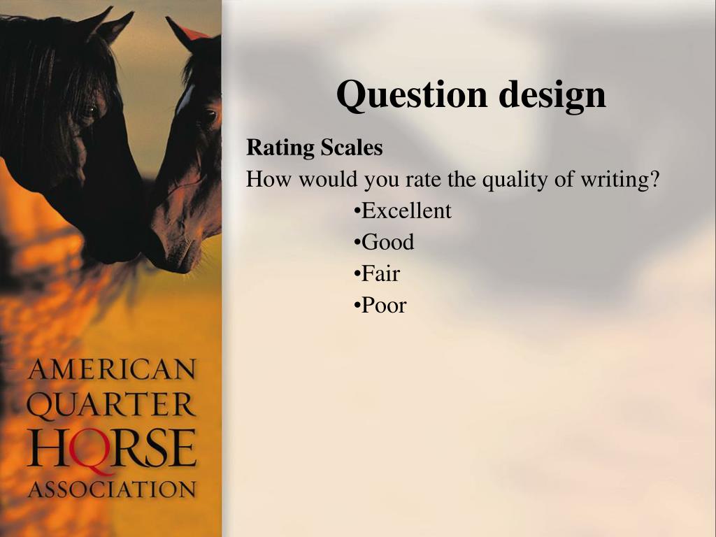 Question design • Rating Scales • How would you rate the quality of writing? • Excellent • Good • Fair • Poor