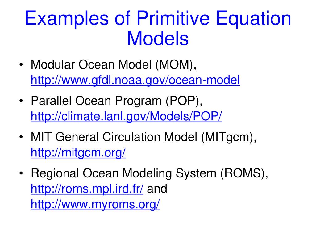 Examples of Primitive Equation Models • Modular Ocean Model (MOM), http://www.gfdl.noaa.gov/ocean-model • Parallel Ocean Program (POP), http://climate.lanl.gov/Models/POP/ • MIT General Circulation Model (MITgcm), http://mitgcm.org/ • Regional Ocean Modeling System (ROMS), http://roms.mpl.ird.fr/ and http://www.myroms.org/