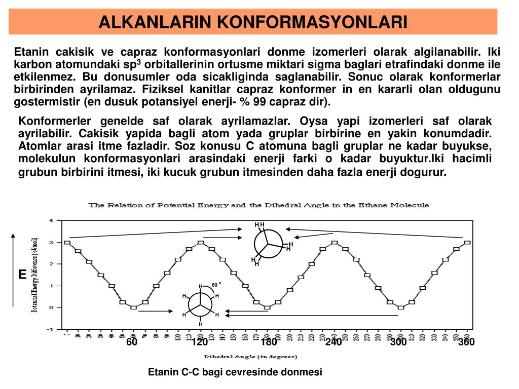 ALKANLARIN KONFORMASYONLARI Etanin cakisik ve capraz konformasyonlari donme izomerleri olarak algilanabilir. Iki karbon atomundaki sp3 orbitallerinin ortusme miktari sigma baglari etrafindaki donme ile etkilenmez. Bu donusumler oda sicakliginda saglanabilir. Sonuc olarak konformerlar birbirinden ayrilamaz. Fiziksel kanitlar capraz konformer in en kararli olan oldugunu gostermistir (en dusuk potansiyel enerji- % 99 capraz dir). Konformerler genelde saf olarak ayrilamazlar. Oysa yapi izomerleri saf olarak ayrilabilir. Cakisik yapida bagli atom yada gruplar birbirine en yakin konumdadir. Atomlar arasi itme fazladir. Soz konusu C atomuna bagli gruplar ne kadar buyukse, molekulun konformasyonlari arasindaki enerji farki o kadar buyuktur.Iki hacimli grubun birbirini itmesi, iki kucuk grubun itmesinden daha fazla enerji dogurur. E 60 120 180 240 300 360 Etanin C-C bagi cevresinde donmesi