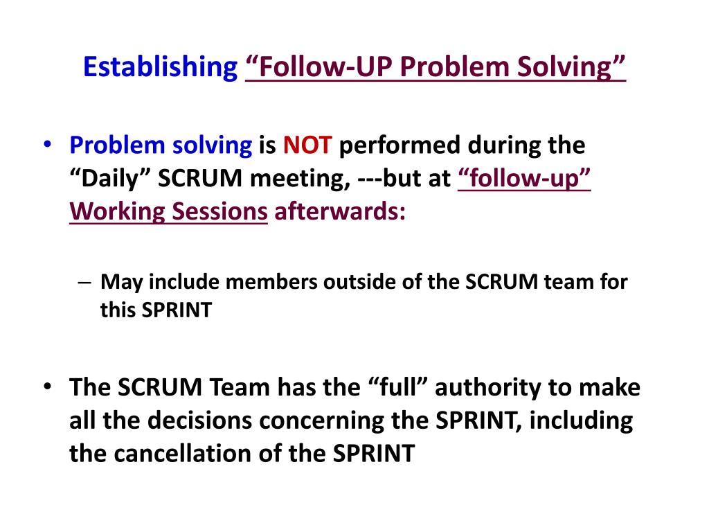 Establishing “Follow-UP Problem Solving” • Problem solving is NOT performed during the “Daily” SCRUM meeting, ---but at “follow-up” Working Sessions afterwards: • May include members outside of the SCRUM team for this SPRINT • The SCRUM Team has the “full” authority to make all the decisions concerning the SPRINT, including the cancellation of the SPRINT