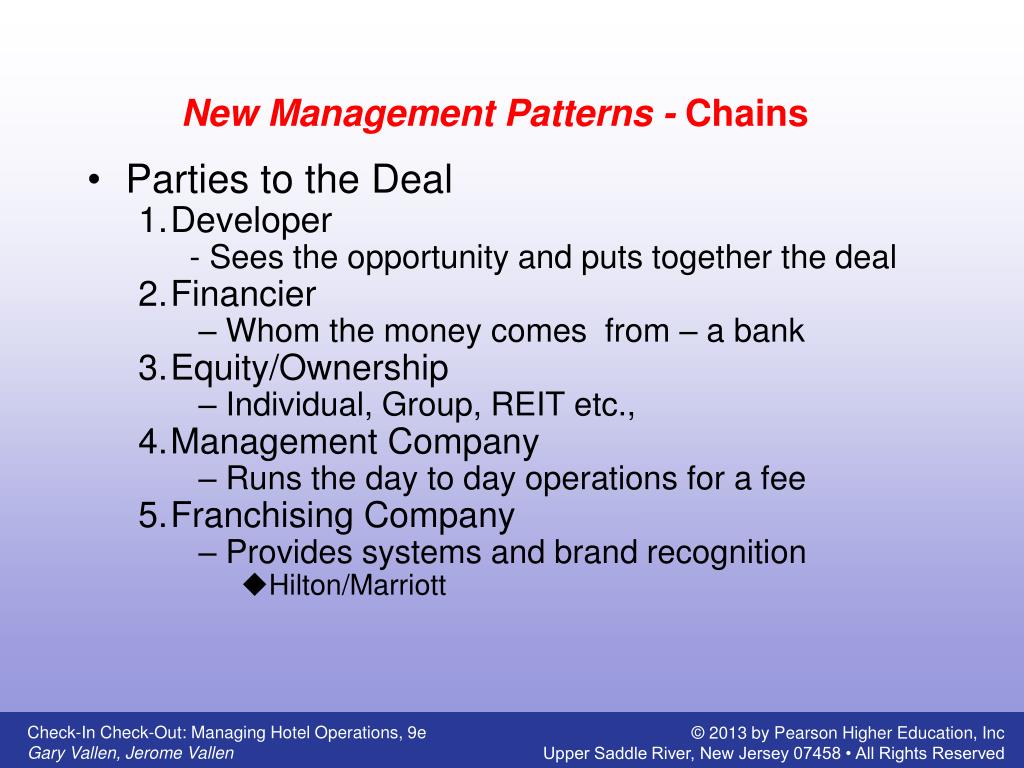 New Management Patterns - Chains Parties to the Deal Developer - Sees the opportunity and puts together the deal Financier – Whom the money comes from – a bank Equity/Ownership – Individual, Group, REIT etc., Management Company – Runs the day to day operations for a fee Franchising Company – Provides systems and brand recognition Hilton/Marriott