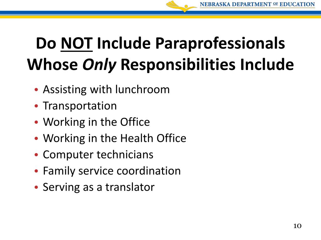 Do NOT Include Paraprofessionals Whose Only Responsibilities Include Assisting with lunchroom Transportation Working in the Office Working in the Health Office Computer technicians Family service coordination Serving as a translator