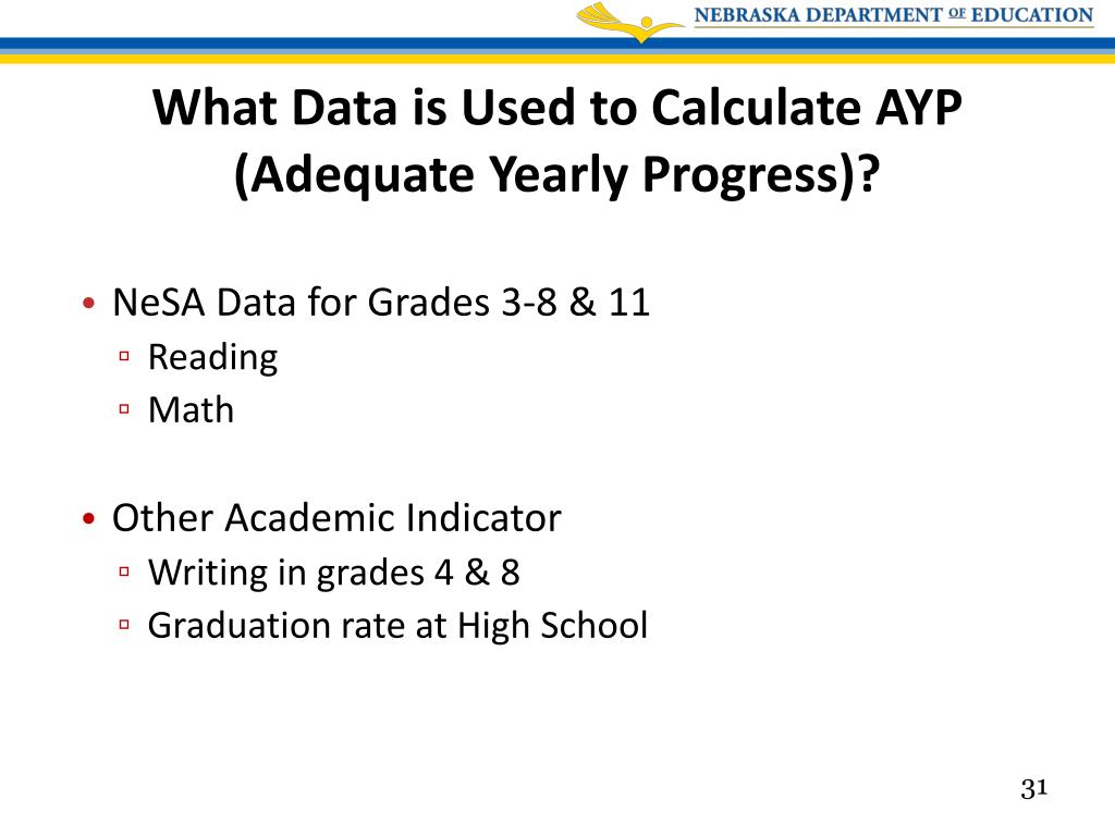 What Data is Used to Calculate AYP(Adequate Yearly Progress)? • NeSA Data for Grades 3-8 & 11 • Reading • Math • Other Academic Indicator • Writing in grades 4 & 8 • Graduation rate at High School