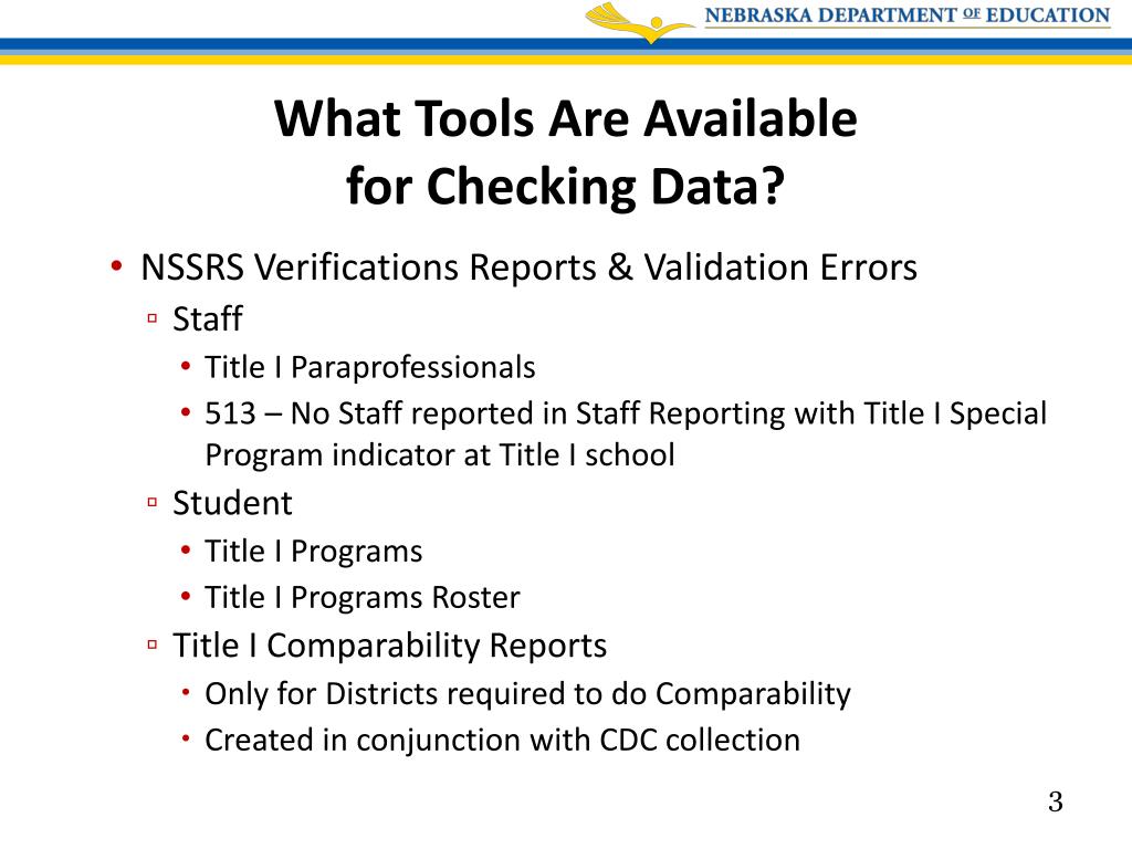 What Tools Are Available for Checking Data? • NSSRS Verifications Reports & Validation Errors • Staff • Title I Paraprofessionals • 513 – No Staff reported in Staff Reporting with Title I Special Program indicator at Title I school • Student • Title I Programs • Title I Programs Roster • Title I Comparability Reports • Only for Districts required to do Comparability • Created in conjunction with CDC collection