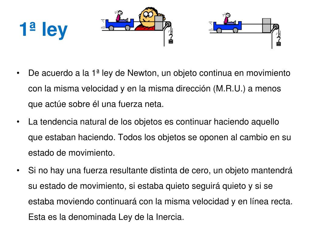 1ª ley • De acuerdo a la 1ª ley de Newton, un objeto continua en movimiento con la misma velocidad y en la misma dirección (M.R.U.) a menos que actúe sobre él una fuerza neta. • La tendencia natural de los objetos es continuar haciendo aquello que estaban haciendo. Todos los objetos se oponen al cambio en su estado de movimiento. • Si no hay una fuerza resultante distinta de cero, un objeto mantendrá su estado de movimiento, si estaba quieto seguirá quieto y si se estaba moviendo continuará con la misma velocidad y en línea recta. Esta es la denominada Ley de la Inercia.