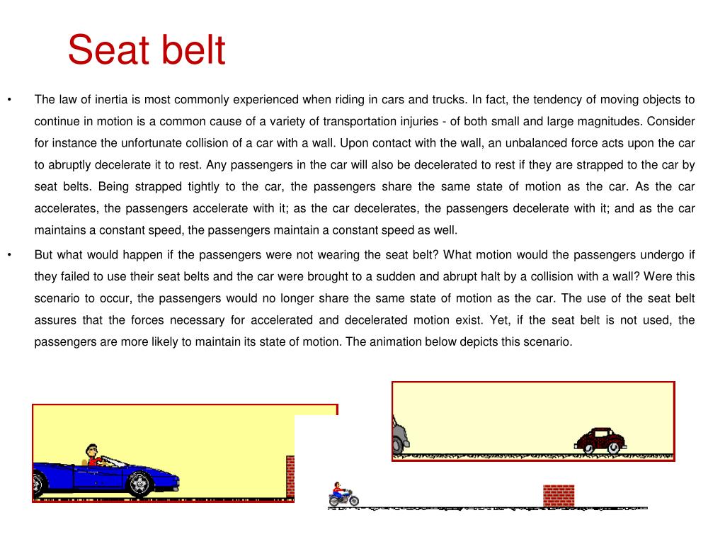Seatbelt • Thelaw of inertiaismostcommonlyexperiencedwhenriding in cars and trucks. In fact, thetendency of movingobjectstocontinue in motionis a common cause of a variety of transportation injuries - of bothsmall and large magnitudes. Considerforinstancetheunfortunatecollision of a car with a wall. Uponcontactwiththewall, anunbalancedforceactsuponthe car toabruptlydecelerateittorest. Anypassengers in the car willalsobedeceleratedtorestifthey are strappedtothe car byseatbelts. Beingstrappedtightlytothe car, thepassengers share thesamestate of motion as the car. As the car accelerates, thepassengersacceleratewithit; as the car decelerates, thepassengersdeceleratewithit; and as the car maintains a constantspeed, thepassengersmaintain a constantspeed as well. • Butwhatwouldhappenifthepassengerswerenotwearingtheseatbelt? Whatmotionwouldthepassengersundergoiftheyfailedto use theirseatbelts and the car werebroughtto a sudden and abrupthaltby a collisionwith a wall? Werethisscenariotooccur, thepassengerswould no longer share thesamestate of motion as the car. The use of theseatbeltassuresthattheforcesnecessaryforaccelerated and deceleratedmotionexist. Yet, iftheseatbeltisnotused, thepassengers are more likelytomaintainitsstate of motion. Theanimationbelowdepictsthisscenario.